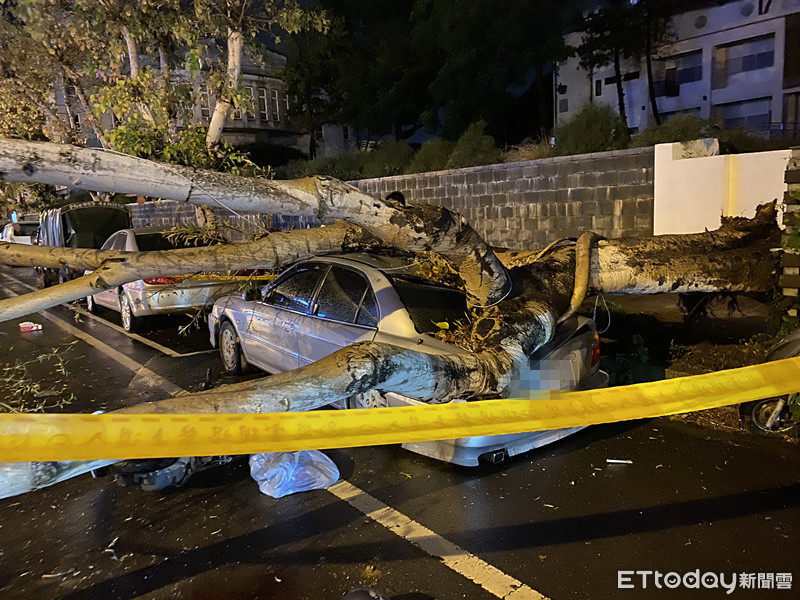 ▲台南市北區延平國中圍牆外人行步道路樹發生倒塌,壓損路旁停放車輛並導致蔡姓女騎士意外身亡遺憾事故。(圖/記者林悅攝)