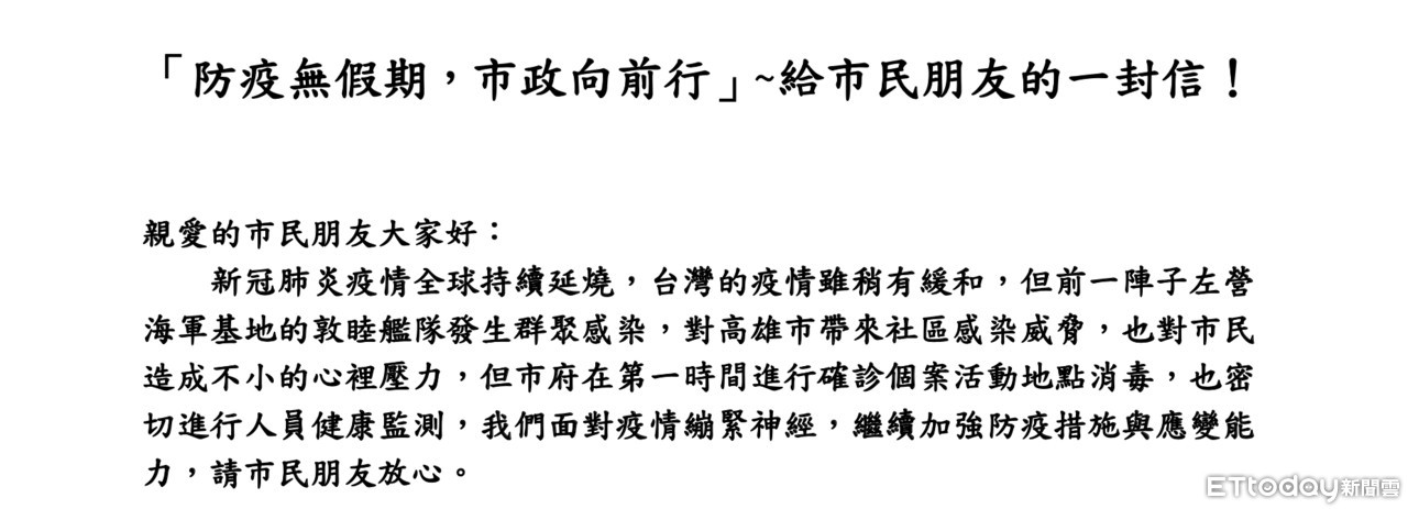 高雄市新聞局透過新聞群組發送澄清內容表示:「這份信件是4月中的構想,因為當時新冠肺炎來勢洶洶,加上韓市長非常擔心接下來是登革熱好發季節,市長單純是想從高雄市大家長的關懷角度來提醒市民做足防疫準備、以及提前防範登革熱」。