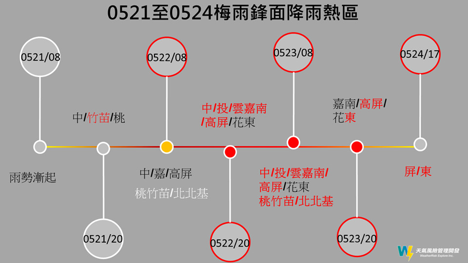 滯留梅雨鋒面持續影響台灣,天氣風險公司總監賈新興就PO出一張圖說明未來幾天的降雨關鍵熱區和時序,他強調,「沒有列出的地方不是都沒事,標示出來的是重中之重」,提醒民眾除了留意豪大雨之外,伴隨的雷擊和瞬間的強風都要特別注意,也不要到山區及河邊。