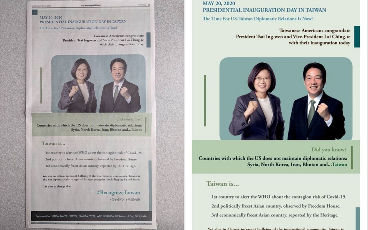 ▲▼10個海外台人社團合資於《華盛頓時報》刊登全版廣告祝賀蔡英文與賴清德就職。(圖/翻攝自Facebook/台灣人公共事務會 (Formosan Association for Public Affairs),點圖可放大)