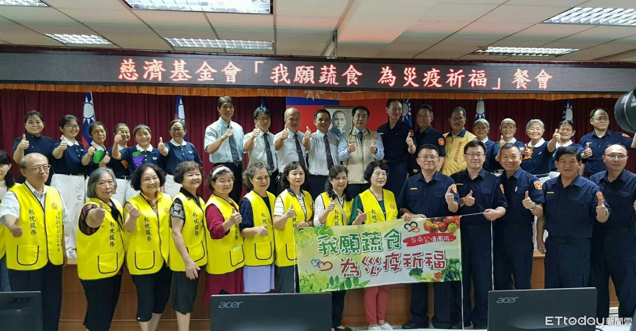 ▲慈濟基金會在台南市警五分局舉辦「我願蔬食為災疫祈福」餐會,台南市長黃偉哲、市警局長周幼偉應邀蒞臨,以行動響應「一日蔬食日」活動。(圖/記者林悅翻攝,下同)
