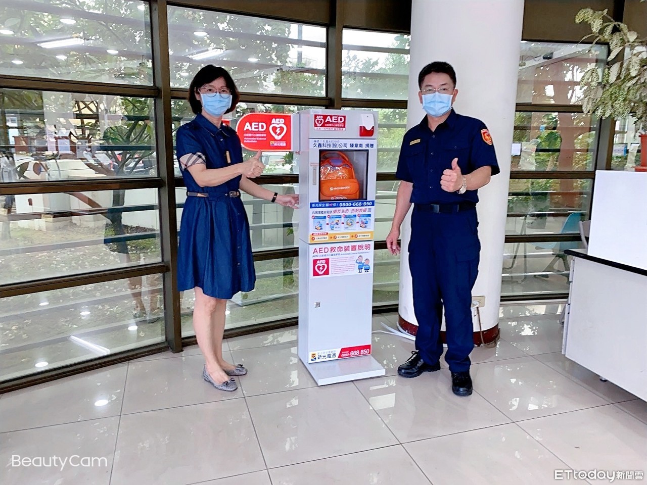▲久鑫科技股份有限公司總經理黃鈴蘭,代表捐贈捐贈2台AED給新化分局,由分局長許芳毅代表受贈。(圖/記者林悅翻攝,下同)