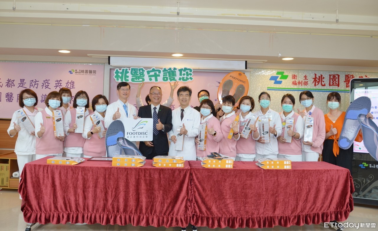▲歐立達公司董事長陳逸弘(左)21日致贈部立桃園醫院醫護人員185雙科技減壓足墊,由部桃院長徐永年代表接受。(圖/記者沈繼昌翻攝)