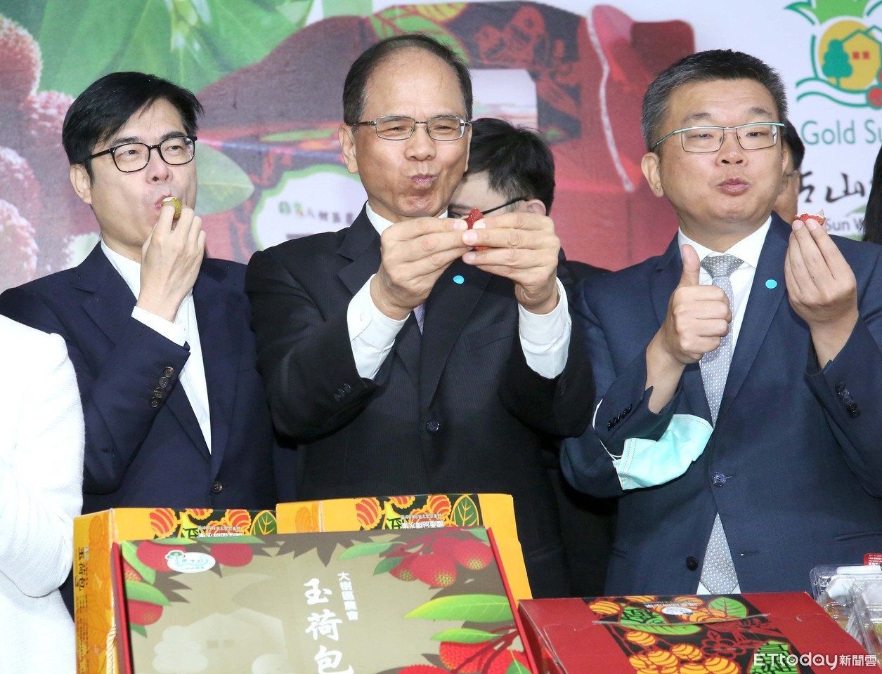▲游錫堃及陳其邁出席活動推銷玉荷包,回應振興相關問題。(圖/記者屠惠剛攝)