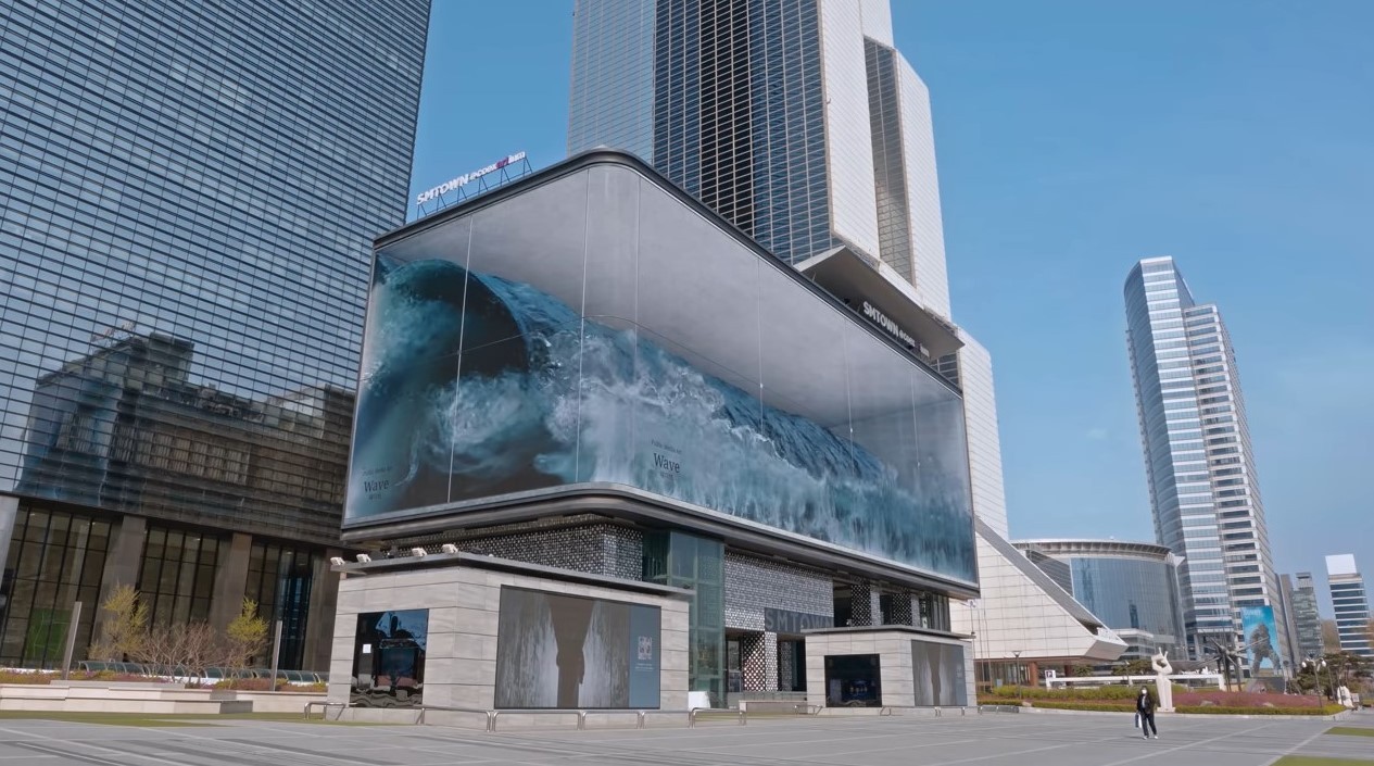 位於首爾江南區黃金地段的Coex Artium大樓,戶外廣告牆面以往大多播放天氣、介紹景點或是SM藝人、三星的宣傳廣告,而最近改投放3D巨浪,聲光效果十足之外,影象呈現也很真實,擅長運用數位媒體技術製作視覺特效的d'strict,前後花費長達4個月時間設計,其中超過4分之3都在計算每幅畫楨的數據,最後成果令人驚豔,來回拍打的海浪極為細膩,一點也看不出科技感。