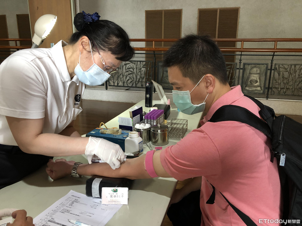 ▼臺中靜思堂舉行骨髓幹細胞驗血活動,出現許多家庭檔,圖為一起大愛共伴的母女檔。
