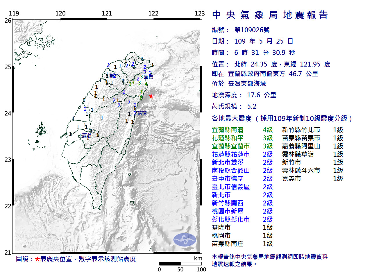● 宜蘭縣地區最大震度4級