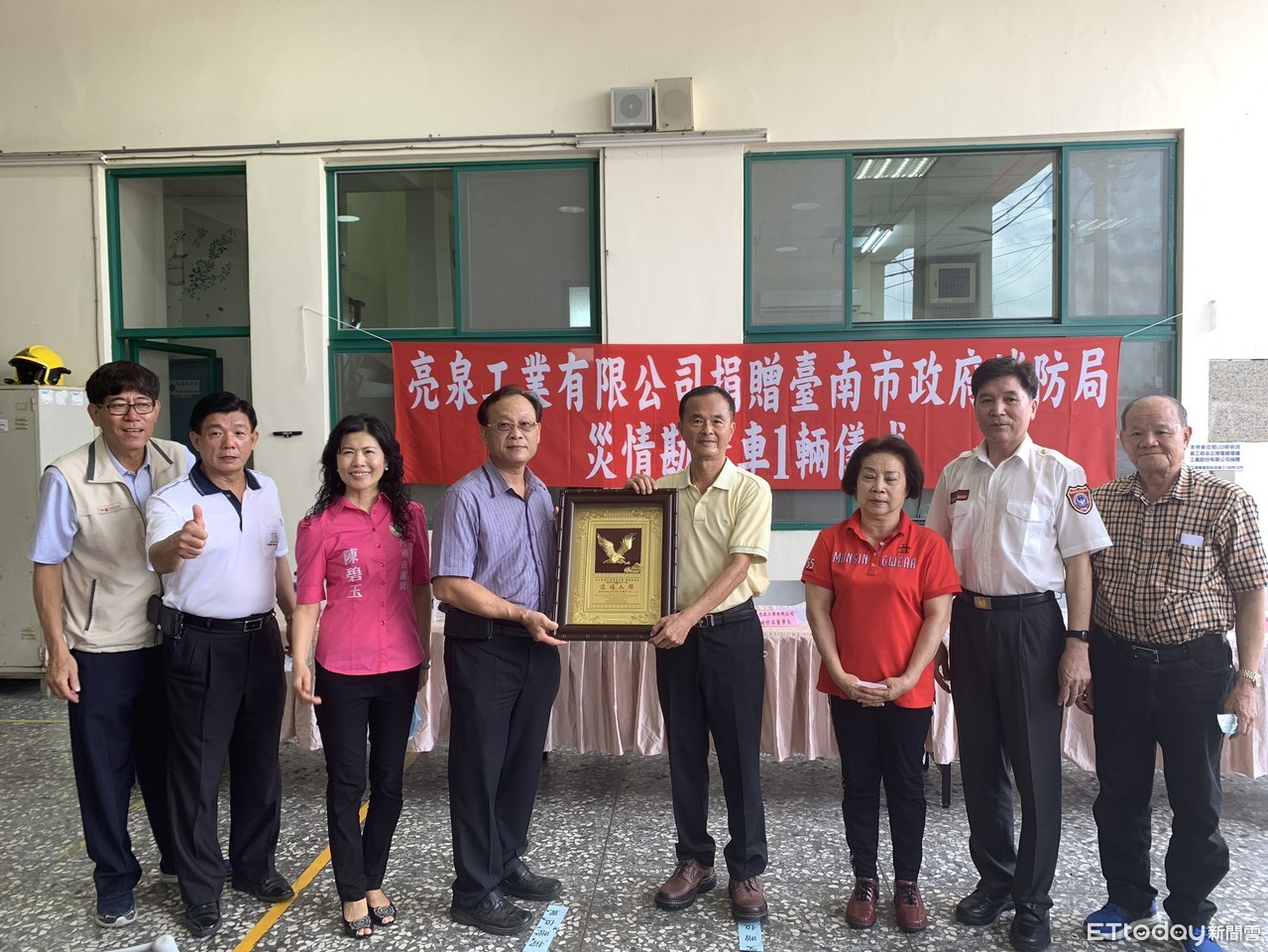 ▲台南在地工業有限公司謝董事長代表捐贈災情勘查車,消防局接受捐贈並頒發感謝獎牌,感謝造福人群的善行義舉。(圖/記者林悅翻攝,下同)