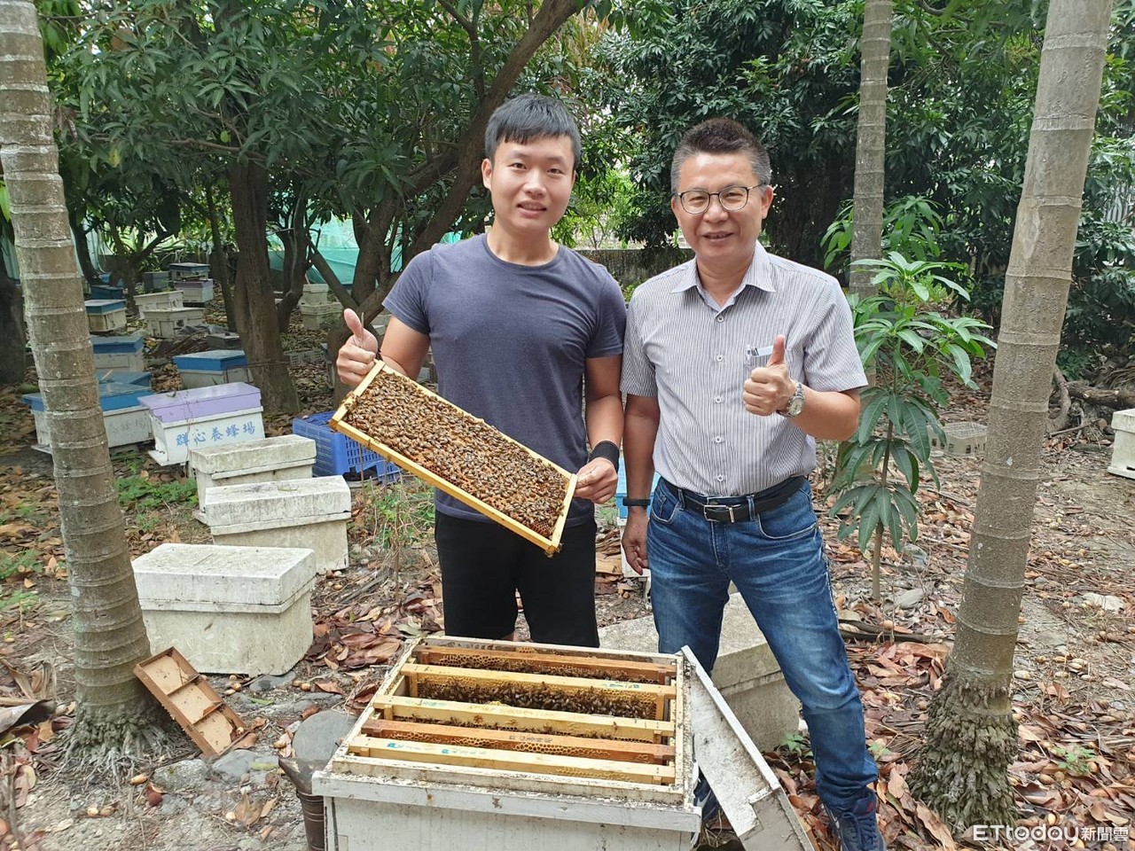 ▲屏東縣新園鄉青農許凱翔(左)喜歡山林養蜂生活,右是農糬署南區分署長姚志旺。(圖/記者陳崑福翻攝)