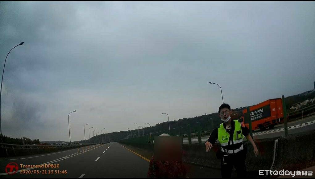 ▲警方接獲通報後立即前往快速道路上援救老婦,待查明身分後並將她送回家。(圖/記者黃孟珍翻攝)