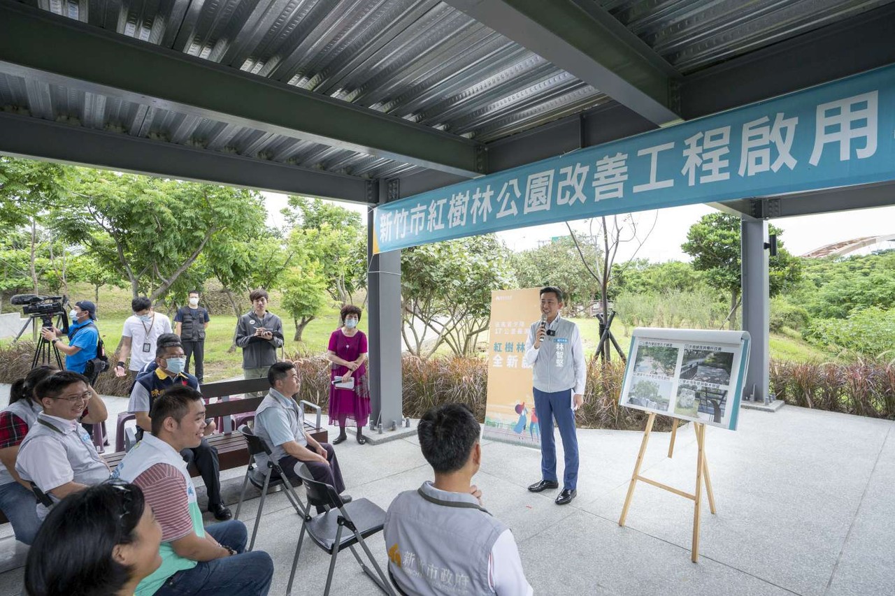 後防疫時代第一場啟用典禮,位於17公里海岸線休憩中繼點的紅樹林公園26日正式啟用,新竹市長林智堅表示,他上任以來投入超過8億元持續改善17公里海岸線以及紅樹林疏伐維護溼地生態,一年內吸引20萬人次造訪,此次工程將紅樹林公園打造為自行車中繼休憩站,打造全新通風明亮的廁所、自行車牽引坡道方便車友進出,最大亮點是利用地勢打造的觀景平台,透過小而美的建設,遊客可在制高點遠眺香山濕地、海景與夕照,遍覽香山最美風景。