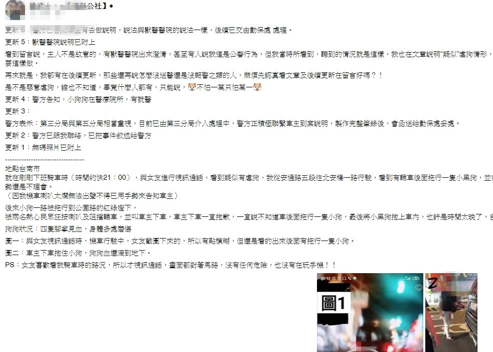 1名胡姓網友於臉書「爆料公社」貼文表示,5月25日晚上9時許,於安南區北安路二段往北安橋方向,發現有輛小貨車後方,有隻小黑狗遭拖行,經過胡男等熱心民眾沿路追趕,始於北區公園路與西門路口將車主攔下,當時小黑狗四肢多處擦傷,腳部滲血,市警三分局主動傳喚劉姓飼主到案說明,函送動保處裁罰。