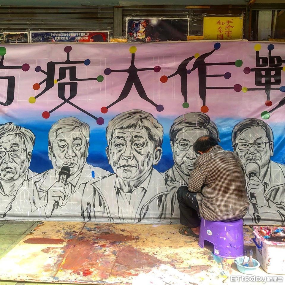 ▲顏振發以寬幅的大型看板畫布,以油畫手繪方式,創作「防疫大作戰」,畫出5位防疫英雄,人物神韻逼真傳神。(圖/翻攝全美今日戲院手繪看板文創研習營場臉書,下同)