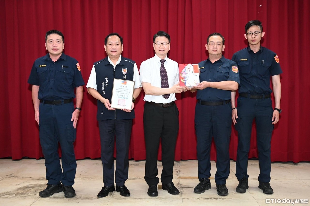 ▲桃園市王姓男子上月持刀企圖性侵女學生案,桃檢檢察長王俊力(中)日前至楊梅警分局頒發榮譽狀給破案有功人員。(圖/記者沈繼昌翻攝)