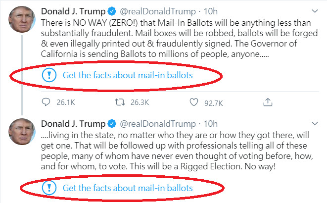 ▲川普的推文內容被推特斷定「具有誤導性」,並在2則貼文下方警告所有用戶,進行事實查核。(圖/翻攝自推特)