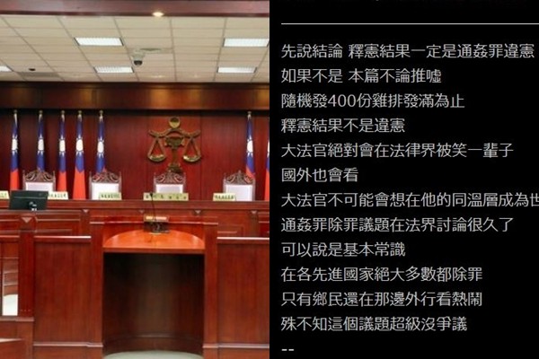 針對通姦除罪化,今(29)日下午4點將進行大法官釋憲,就有鄉民鐵口直斷「通姦100%會除罪」,並發出祭品文,表示若結果相反,就隨機發送400份雞排,甚至笑虧「通姦除罪在法界可說是基本常識,只有外行在看熱鬧!」
