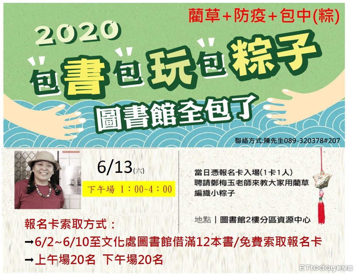台東縣政府文化處表示,圖書館端午節閱讀推廣活動自6月2日開始一直持續到6月30日止,除了在圖書館1樓展出端午節、手工藝相關書籍之外,還特別邀請星期天老師和鄭梅玉老師一起和大家包粽子。