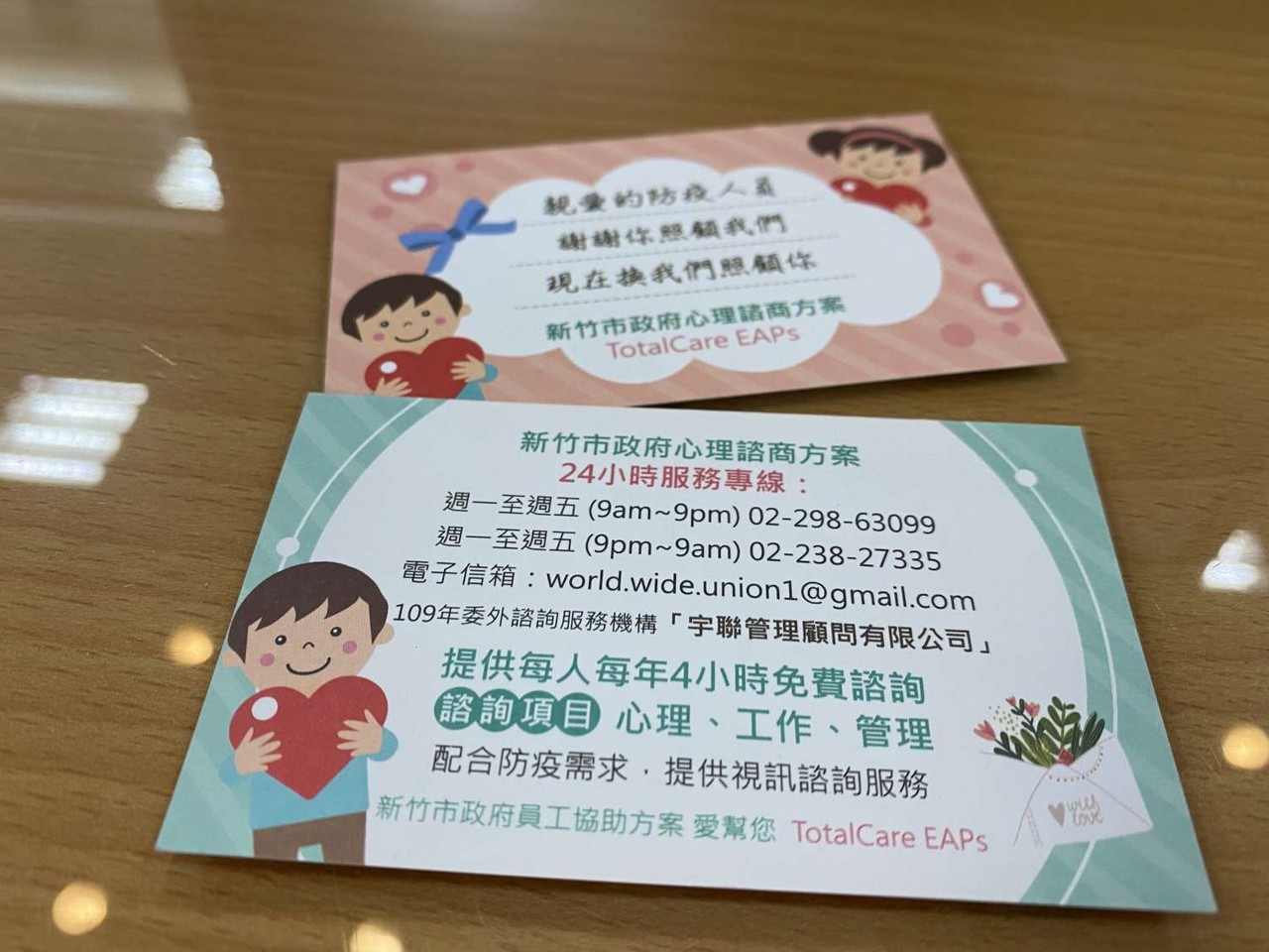 新竹市防疫工作啟動以來逾4個月,區公所、里幹事、衛生局、衛生所與警消同仁、環保局等一線防疫團隊,經歷一百日以上密集防疫工作,新竹市長林智堅表示,「照顧人的你們,也需要被照顧」,近日啟動客製化的心理諮商服務,由人事處委由專業心理諮商事業團隊,向防疫一線同仁主動提供24小時不分日夜的免費諮商服務,更特別一一送上諮商小卡,鼓勵同仁多加利用,照顧防疫英雄們的身心健康。