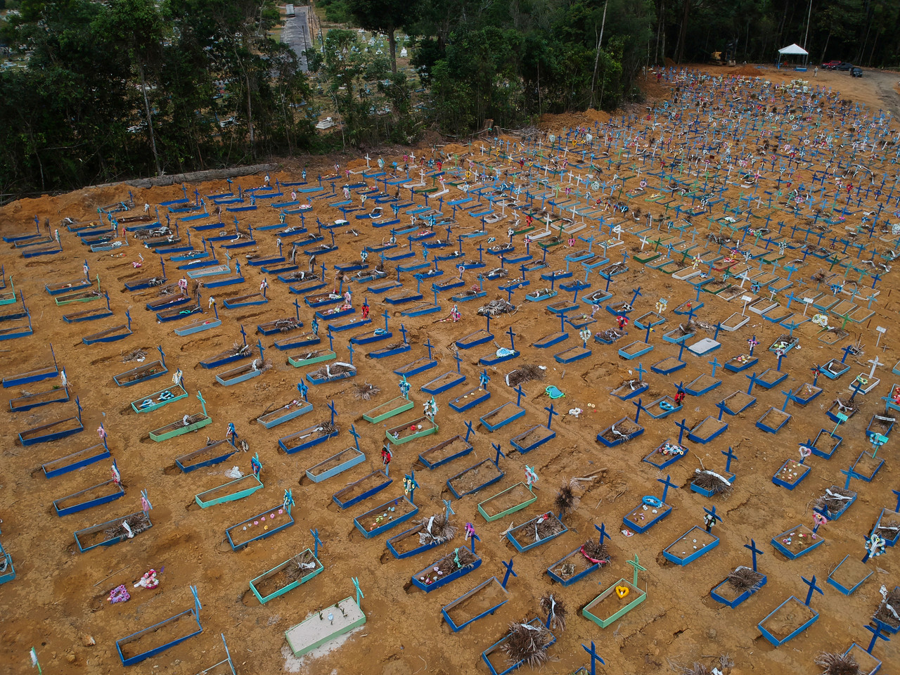 根據《商業週報》報導,根據華盛頓大學健康指標與評估研究所(IHME)研究報告指出,如果巴西沒有針對疫情做出任何改善措施,到了8月4日時,死亡人數將飆至125,833人,美國死亡人數屆時也將升至131,967人,在「單日」死亡人數上,巴西將會超越美國。照片上每一個藍色、綠色的十字架,都代表著一名死者,遍地的墳墓可以想像疫情帶給人民的悲痛。