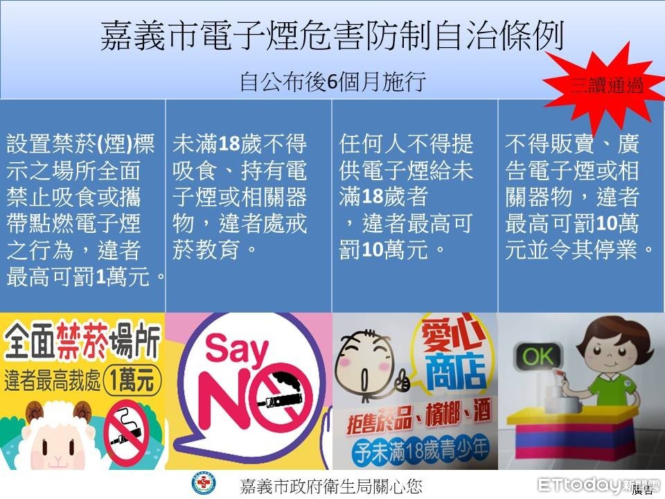 衛生局局長張耀懋表示,本自治條例制定重點包含未滿18歲不得吸食、持有電子煙或相關器物;任何人不得提供電子煙給未滿18歲者,違者最高可罰新臺幣10萬元;設置禁菸(煙)標示之場所也全面禁止吸食或攜帶點燃電子煙之行為,違者最高可罰1萬元;另不得販賣、廣告電子煙或相關器物,違者最高可罰新臺幣10萬元並命其歇業,該自治條例將於公布後6個月正式實施,提醒市民應配合遵守,共同守護嘉園健康。
