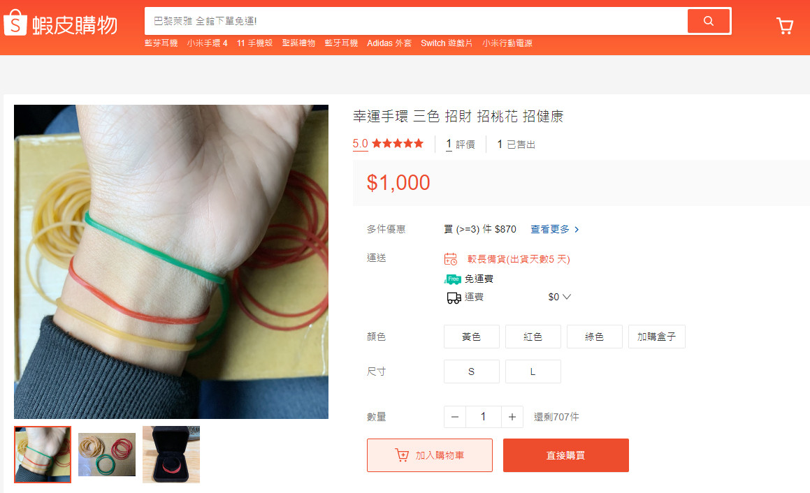 網路購物愈來愈發達,各式商品無奇不有。有網友近日上網發現,蝦皮賣場上販售一款「幸運手環」,號稱能招財、招桃花,具有開運功效,但外觀幾乎與一般橡皮筋無異,而且一個就要價1000元,引發熱議。