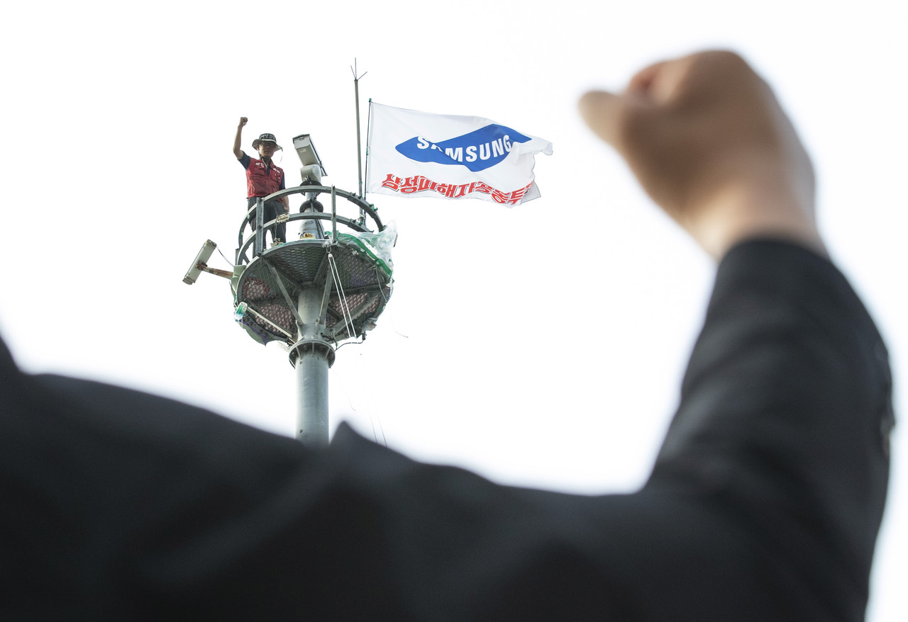南韓三星電子副會長李在熔5月6日曾針對工會設立問題、接班時存在的違法行為,召開記者會對全國人民鞠躬道歉,其中關於工會設立之爭議,將可望儘速解決!曾因試圖組建工會,慘遭三星解雇的金容熙(김용희,音譯)過去長期控訴資方非法打壓工會,29日在眾人簇擁下,搭乘雲梯車下塔,終於結束長達355天的「高空示威」。