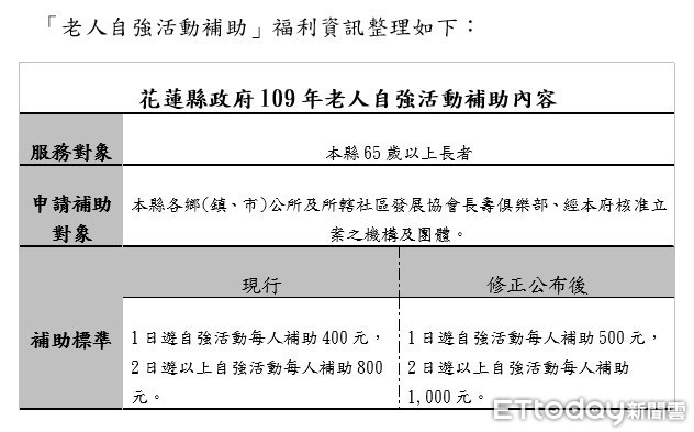 ▲修訂前後補助資格及金額對照表。(圖/花蓮縣政府提供)