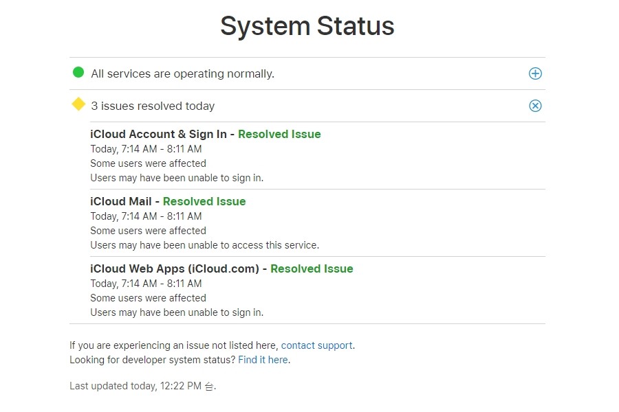 根據蘋果系統狀態頁面,今日上午7點14分至8點11分,iCloud帳號與登入、iCloud郵件及iCloud網頁App出現問題,使用者可能無法登入或存許服務。目前則已恢復正常,所有服務正常運作。