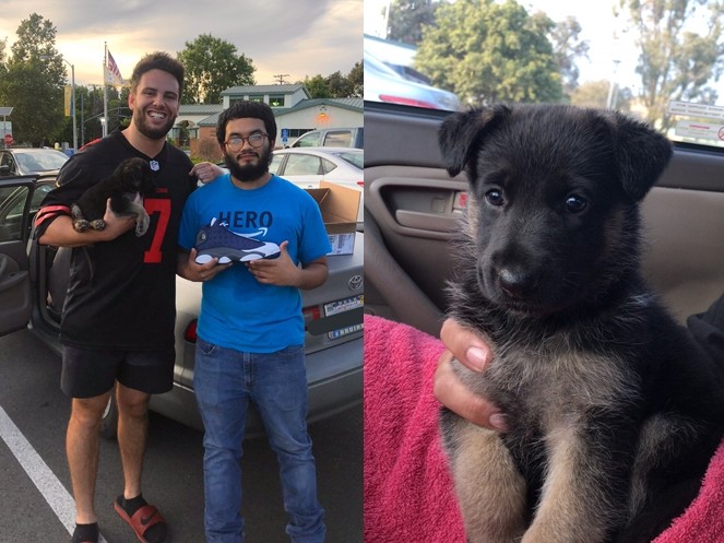 Air Jordan 13「Flint Grey」是最早推出的幾個配色之一,這次是最忠於原版的復刻,全鞋採用具反光特性的藍色布料、麂皮以及白色皮革組成,定價為美金190元(約台幣5,700元),Connor則是開價美金300元(約台幣9,000元),後來名為Gustavo的網友詢問能否用純種德國牧羊犬來交換,Connor沒有回應,而是直接貼出面交照片,並寫上「我的夢想成真」、「這場交易我想我贏了」的感想。