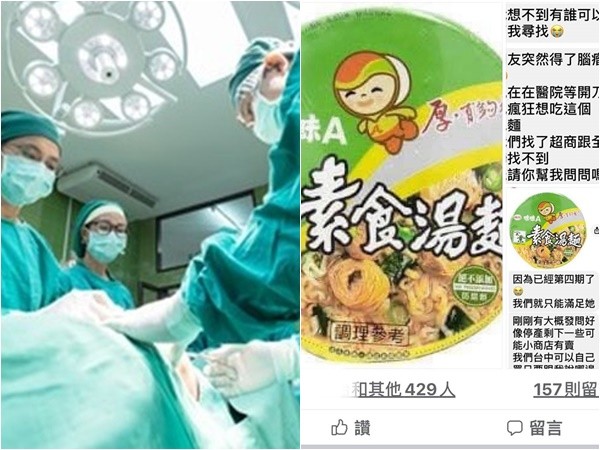 一名女網友在臉書社團「爆廢公社」PO文表示,她日前收到朋友的消息,希望可以幫忙一名腦癌四期的女病患尋找早已斷貨的泡麵;她們集結不少網友,搜尋各大網站、跑遍各大超商及雜貨店,卻都沒有下文。