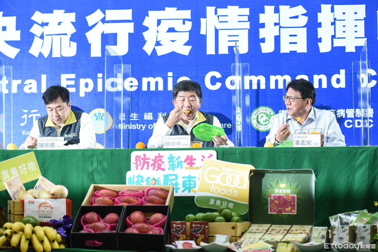▲▼在疫情記者會上出現的農產品業配。(圖/記者洪巧藍攝、指揮中心提供)