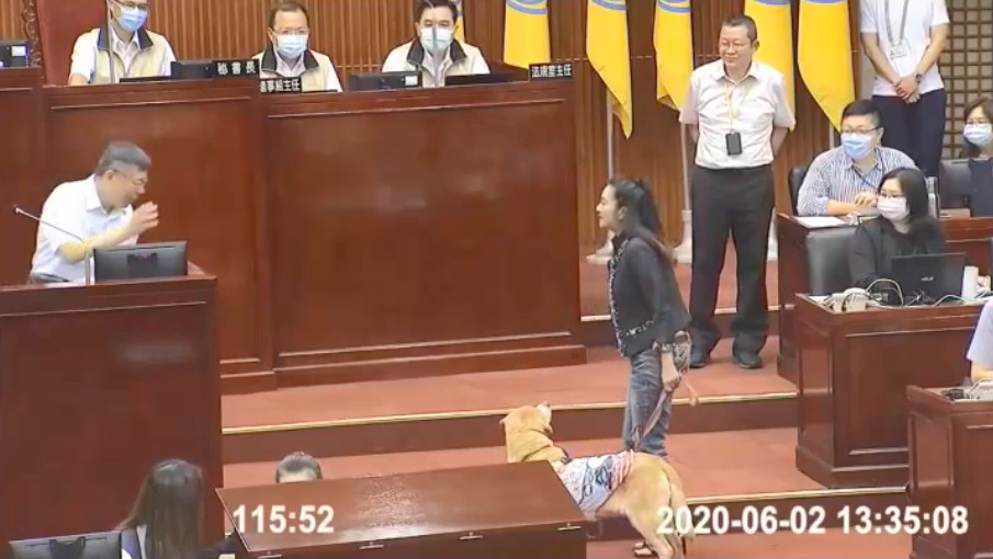 ▲臺北市議員應曉薇牽著10歲的退休導盲犬DIOR前進議會,向臺北市長柯文哲請命成立「市立寵物長照安寧中心」,獲得市長正面回應後,不忘帶著DIOR跟市長敬禮道謝,萌翻眾人。(圖/應曉薇辦公室提供)
