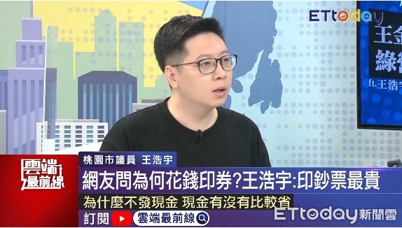 行政院宣布推出「振興三倍券」,但不少民眾覺得使用程序過於複雜,對此,台北市議員王世堅痛批政府搞得太複雜,「發現金為何變成犯罪?」桃園市議員王浩宇在4日的ETtoday《雲端最前線》直播時即時回應網友,若發現金就得印新鈔,但鈔票印製成本高昂,且台灣儲蓄率高達七成,要是民眾將錢存起來反而達不到刺激消費的效果,所以「現金是最貴的」。