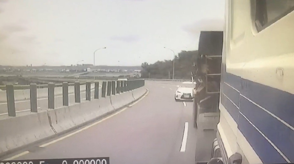 行車紀錄器畫面拍下,當時砂石車沿著車道直行,但後方一輛白色自小客卻突然高速駛近,還從內側車道跨越到外線道,隨後猛力撞上砂石車車尾,自小客車頭瞬間爛毀。