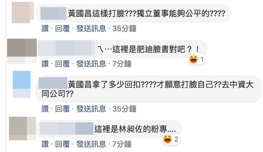 根據林昶佐的照片顯示,他的粉專留言處中出現許多批評黃國昌的言論,包括「黃國昌這樣打臉?獨立董事能夠公平的?」、「黃國昌進入大同董事會,也很難維持獨立性吧?」、「昔日戰神去哪了?」等留言。對此,林昶佐表示,原本想去回機器人留言,但是好像機器人又刪文了。