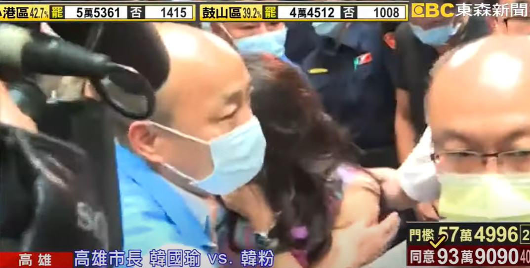 國民黨高雄市長韓國瑜罷免同意票高達93萬9090,遠超越2018年當選的89萬票,確定遭罷免,傍晚5時30分出面召開說明會,有不少粉絲特地趕到市府打氣,一見到他就高喊「市長我們愛你!」還有一名長髮女子當場淚崩,韓也不捨地上前給予抱抱安慰。