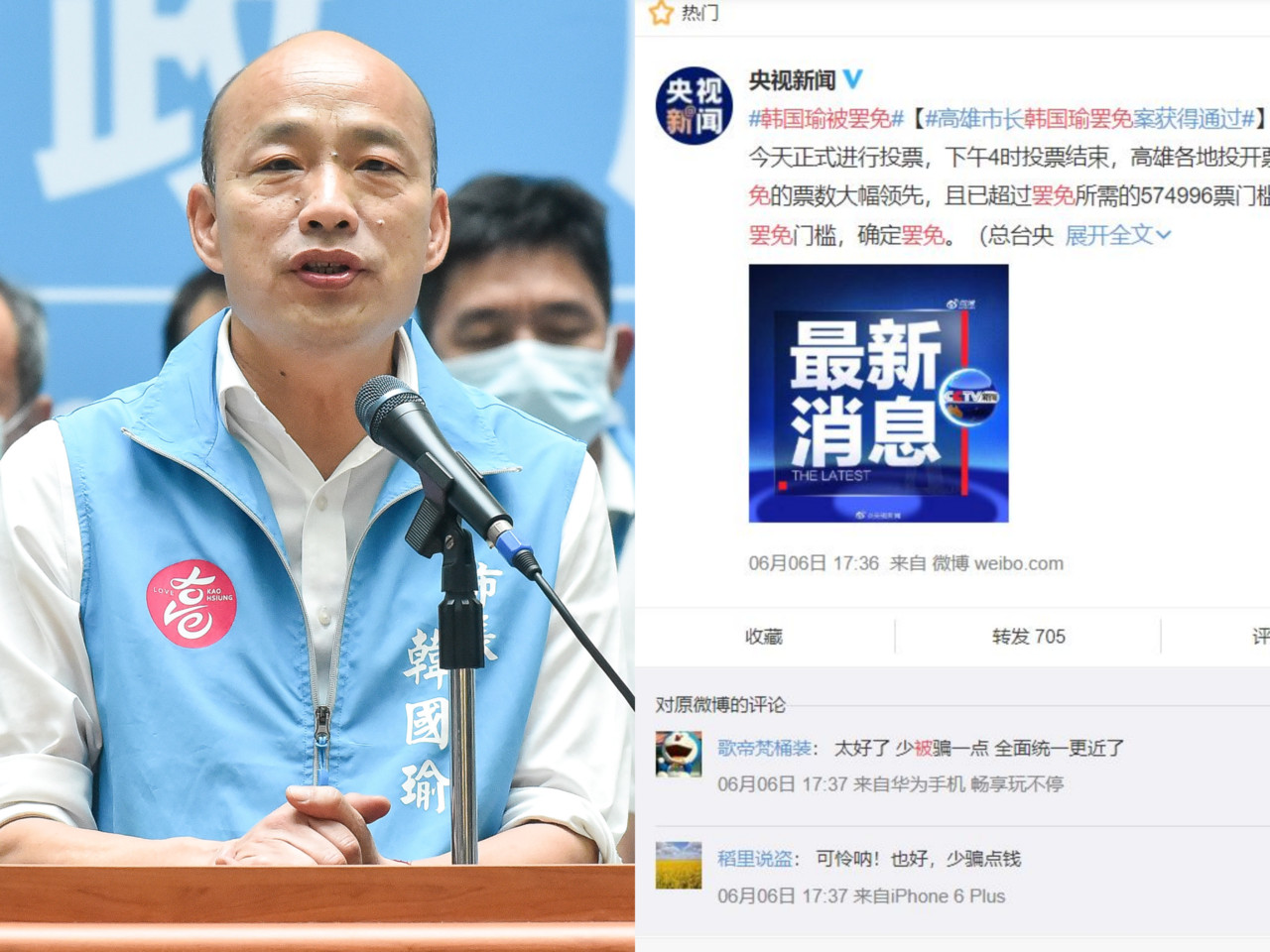 ▲ 央視新聞報導韓國瑜被罷免 。(圖/翻攝自微博)