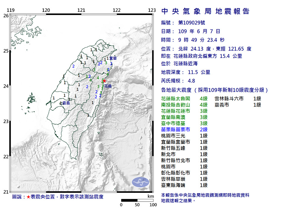 花蓮縣新城09:49發生芮氏規模4.8地震,最大震度出現在花蓮有4級。台鐵表示,受到地震影響,崇德至鳳林間按4級規定辦理,已通知工、電單位派員巡查路線及電車線,該區間南下、北上列車有延誤。