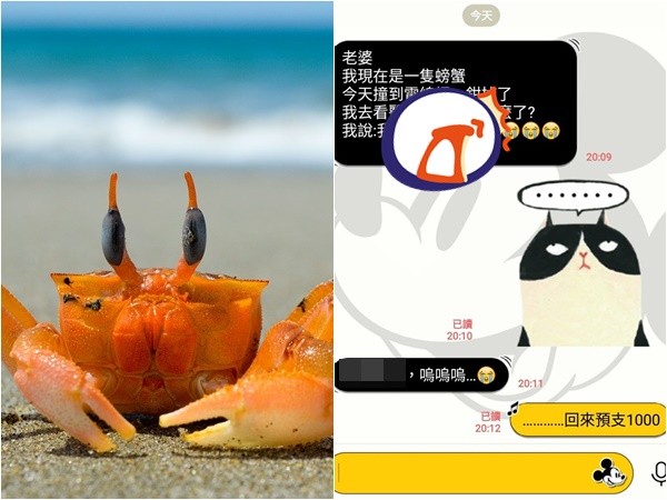 許多男生婚後會將收入交給妻子,讓其掌管家中大小支出,包括自己每日的花費,但在外難免一不小心透支,便須想些花招跟老婆大人求饒,才能順利拿到金援。一名男網友使用了「螃蟹雙關語」的笑話,讓網友看完都笑翻,大讚幽默。