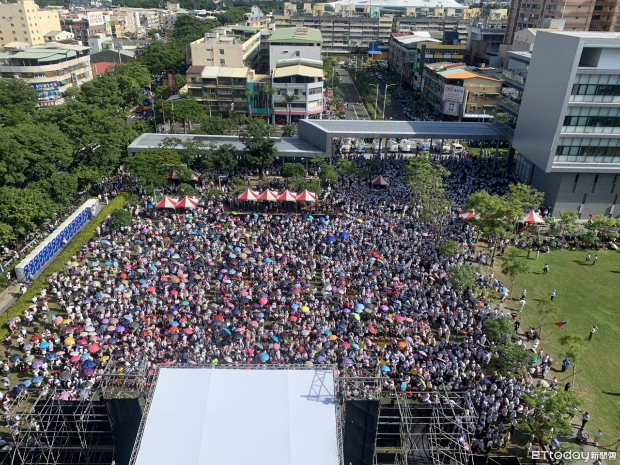 高雄市長韓國瑜即將被解職,11日舉辦「道別音樂會」,究竟來了多少韓粉,根據市府轉述高雄市政府鳳山分局的粗估人數為1萬8千人,而透過空拍照片可以發現,鳳山辦公室的活動舉行草地都是陽傘跟白衣,而由於天氣炎熱, 所以市府一樓的走廊通道也都是人。