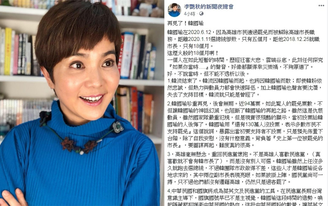 「再見了!韓國瑜」。李艷秋表示,韓國瑜任職高雄市長有18個月,「這煙火般的18個月啊!一個人在如此短暫的時間,歷經狂喜大悲、雲端谷底」,不說當時,但不能不透析以後,因此列出5項分析。