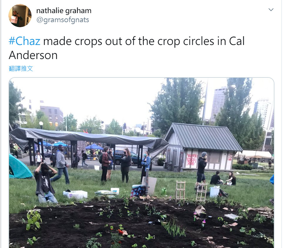 一位名叫nathalie graham的推特帳號,發布一張照片,顯示叛亂組織開始開墾卡爾安德森(Cal Anderson)公園種植農作物。