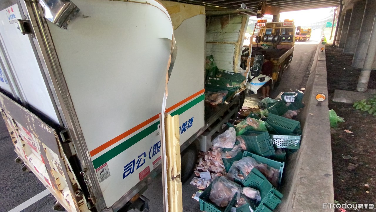 據了解,事發時小貨車行駛於外側車道,疑似未注意車前路況,高速撞上前方拖板車車尾,小貨車車頭當場凹陷變形,駕駛被夾著困在車內失去意識,小貨車車廂也因撞擊破裂,裡面大量的冷凍雞肉和藍色塑膠籃散落一地,現場一片狼籍。