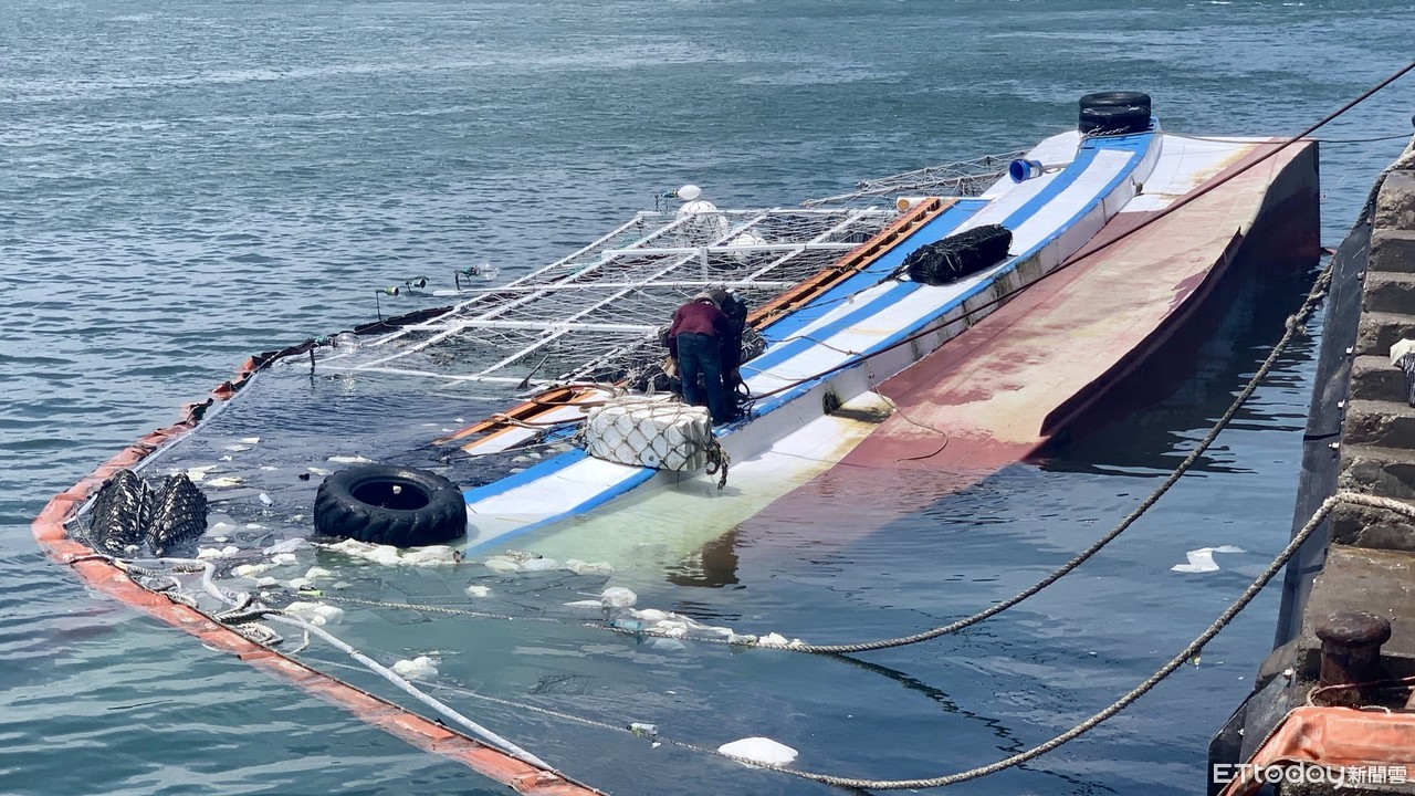 據了解,野柳漁港籍「漁發286號」漁船,因纜繩太短,退潮時碰撞碼頭階梯,導致漁船傾斜翻覆,萬里區漁會理事長練聰明協同總幹事許順發已經抵達現場協助船主處理,預計15日下午漲潮扶正後抽水,再拖回萬里野柳港。