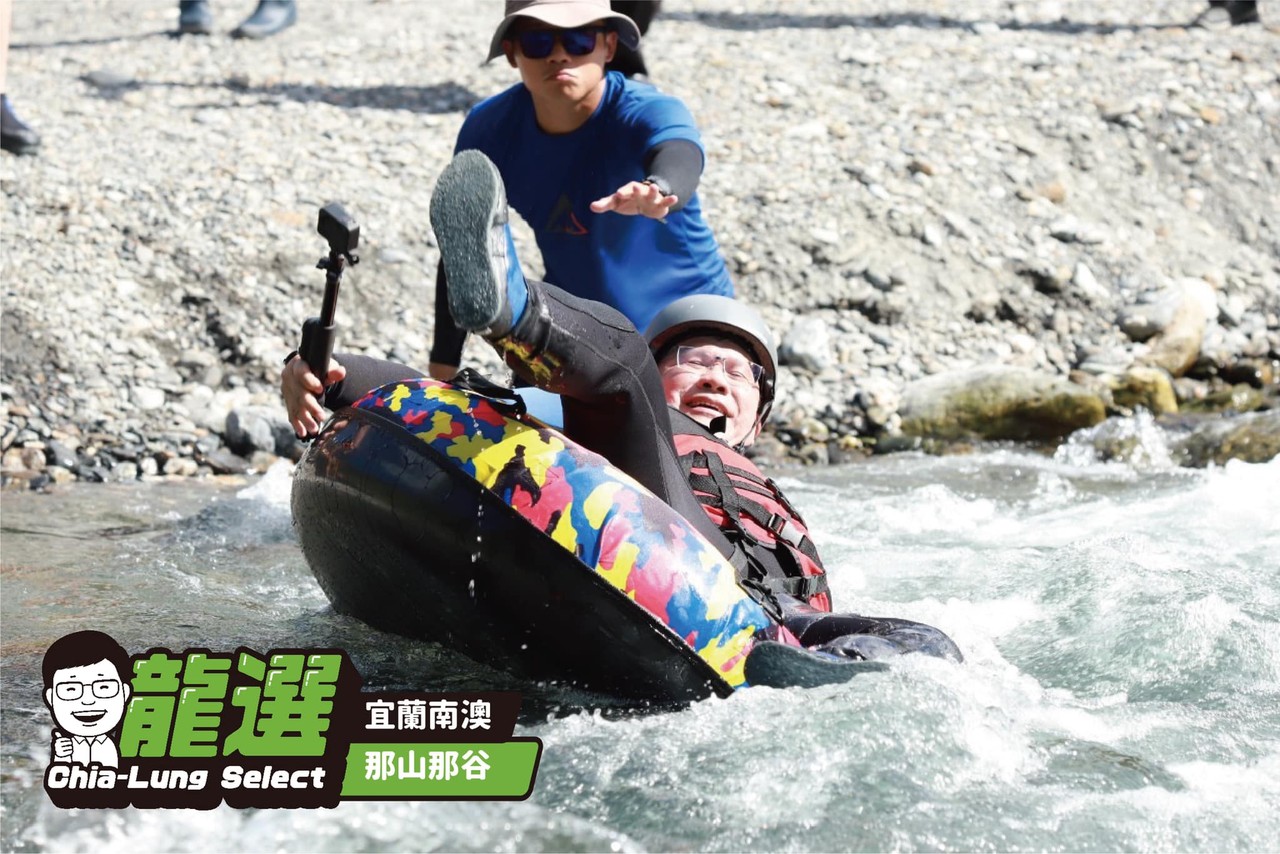 國內旅遊正夯,交通部長林佳龍親自出馬,至宜蘭那山那谷玩起漂漂河,甚至到瀑布下「沖水修煉」,只見林佳龍坐上泳圈、衝出湍急的溪流後,重心不穩立刻翻船。