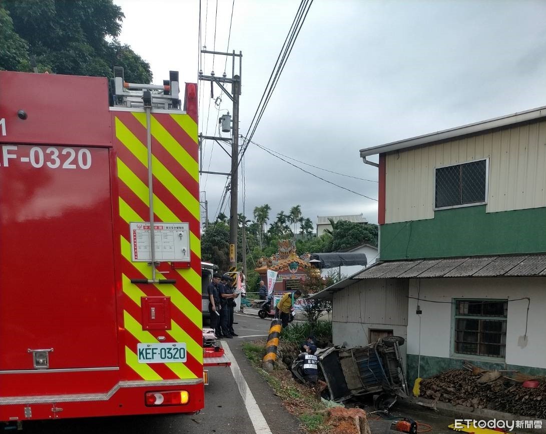 救護人員抵達現場後,肇事發財車側翻於大排,四周散落許多零件及物品且撞斷電信電桿,車內1名駕駛受困,救護人員立即上前評估傷者生命徵象及傷勢,相關肇事原因由警方調查中。