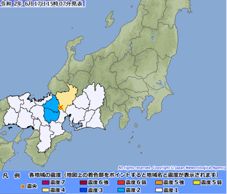 日本岐阜縣在當地時間17日下午15時03分左右發生地震,震央位於岐阜縣美濃中西部(北緯35.5度,東經136.5度),深度10公里,最大震度4,預估規模4.2,並無海嘯風險。