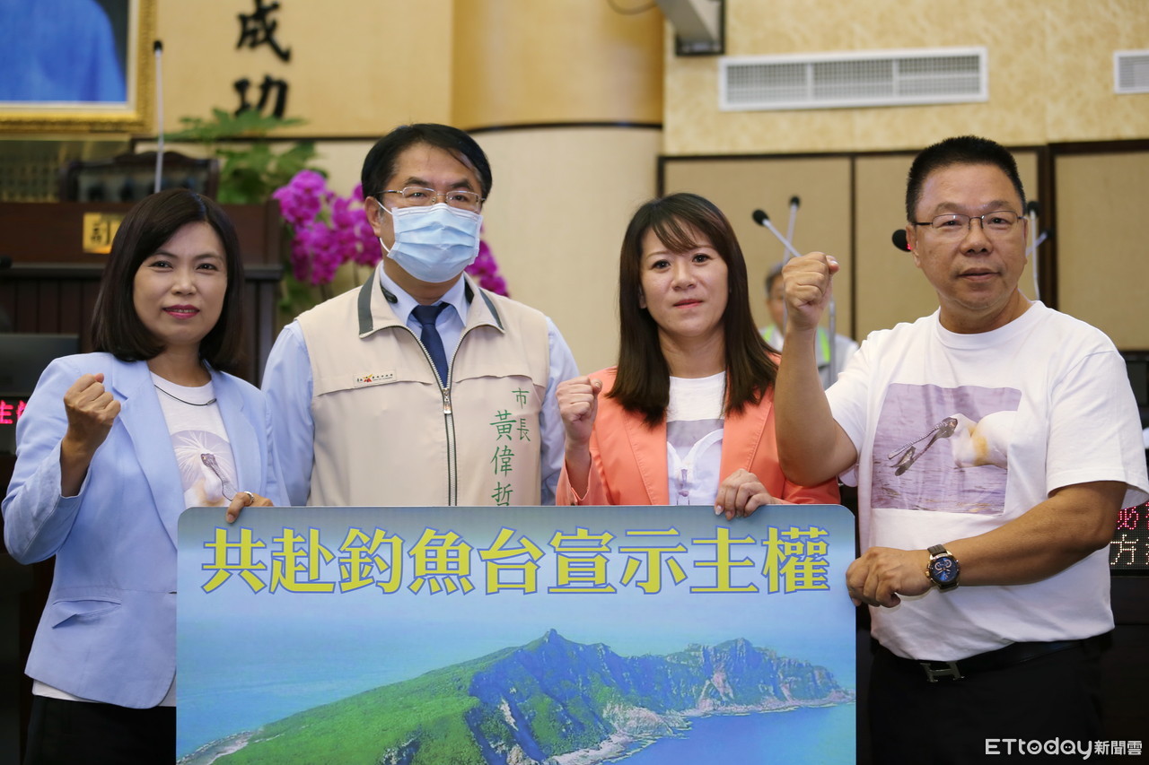▲台南市議員蔡育輝、蔡淑惠、李中岑,特別拿著印有釣魚台圖像上寫著共赴釣魚台宣示主權的看板,遞交黃偉哲。(圖/記者林悅翻攝)