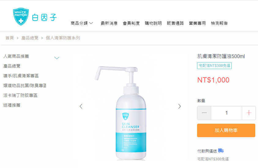 ▲白因子肌膚清潔液宣稱「可抗菌」,廣告涉誇大不實,遭新北市衛生局開罰。(圖/翻攝自白因子官網)