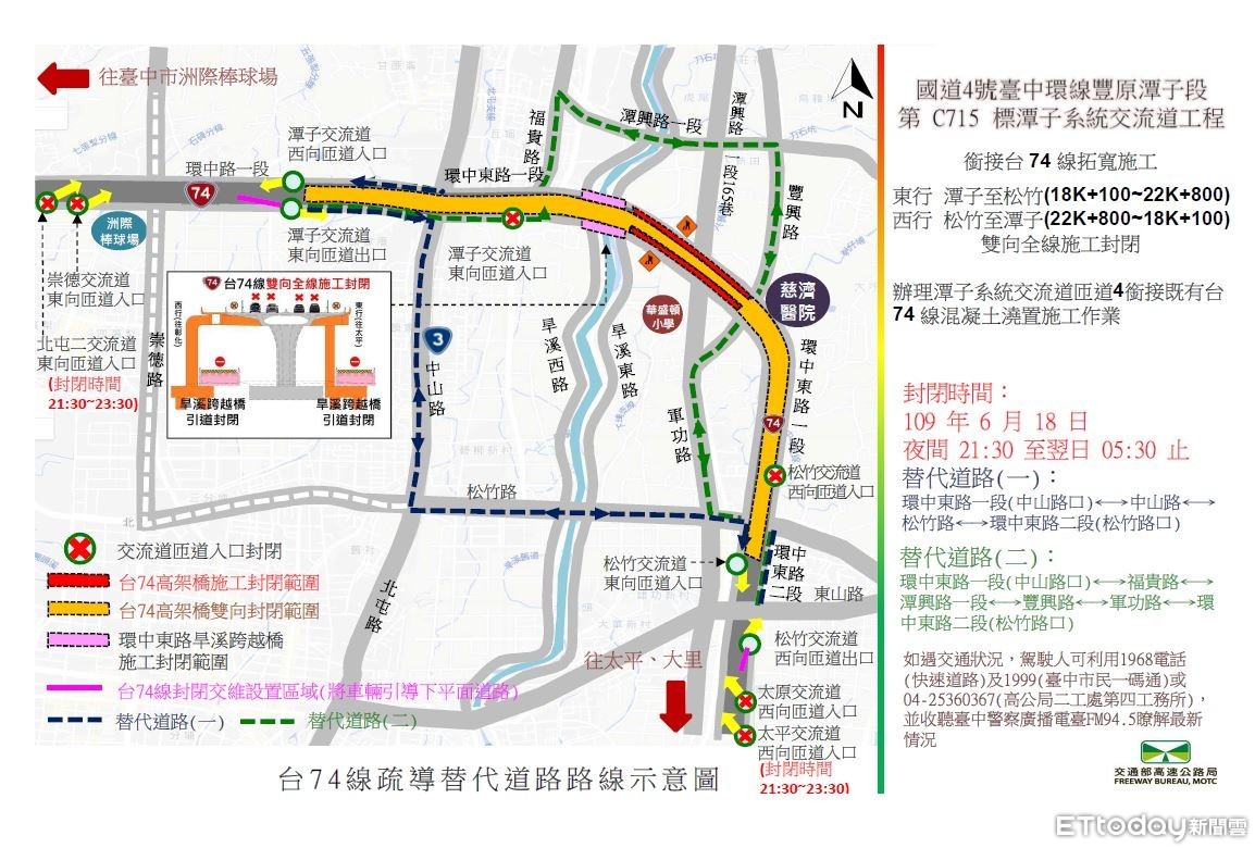 交通部高速公路局第二新建工程處國4豐潭段工程銜接台74線拓寬施工,預計18日晚間9時30分起至翌日清晨5時30分止,封閉台74線東行崇德匝道入口、潭子至松竹(18K+100~22K+800) 路段雙向全線及西行太原匝道入口,進行台74線拓寬混凝土澆置等施工作業;另同日晚間9時30分至11時30分止,封閉東行北屯二匝道入口及西行太平匝道入口。